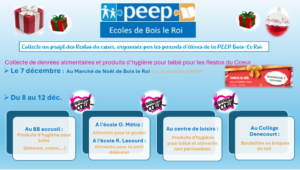 Comme l’année dernière, la PEEP souhaite organiser une collecte au profit des Restos du Cœur dans les établissements de Bois-le-Roi, en soutien à l’antenne de Dammarie-les-Lys.